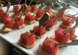 Our canapé range includes over 30 varieties, including: Salmon & cream cheese blinis Tuna tapenade with broccoli Prawn & avocado crostini Vine tomato with mozzarella & basil Spinach wrap with chicken & mango salsa Halloumi with quince jam Mini yorkshires with beef & horseradish cream Duck parfait with caramelised orange Spiced tuna with beetroot Whipped Feta & black olive